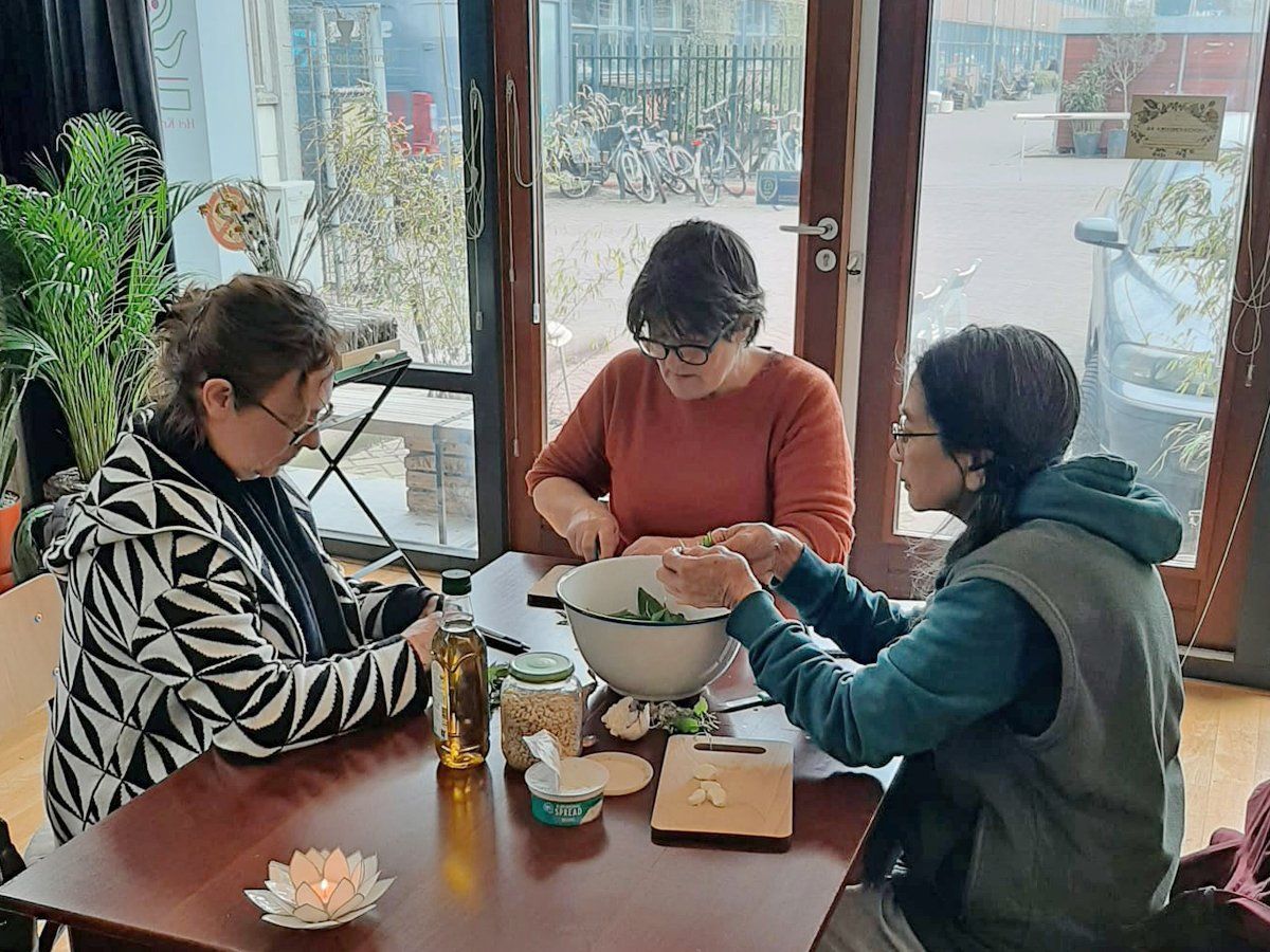 Tijdens de workshop zijn we in diverse aspecten van de kruidengeneeskunde- en eigenschappen van de voorjaarskruiden gedoken. Natuurlijk zijn we ook lekker naar buiten gegaan om de kruiden te zoeken en besturen, én om er lekkere en gezonde recepten mee te maken!
